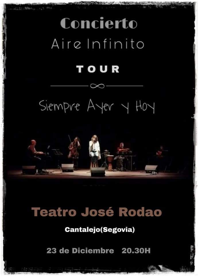 19:30 h: Concierto de Música «AIRE INFINITO» ACTUAMOS 2018- DIPUTACIÓN DE SEGOVIA. Fusión de géneros, con composiciones adaptadas a un estilo musical propio, BLUES, JAZZ, SOUL con toques FLAMENCOS. Grupo formado por 5 intérpretes. Entrada:2€. Lugar: Centro Cultural“José Rodao