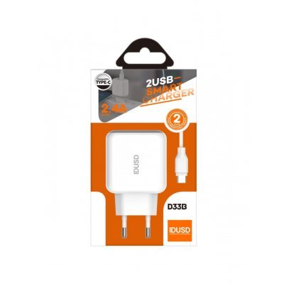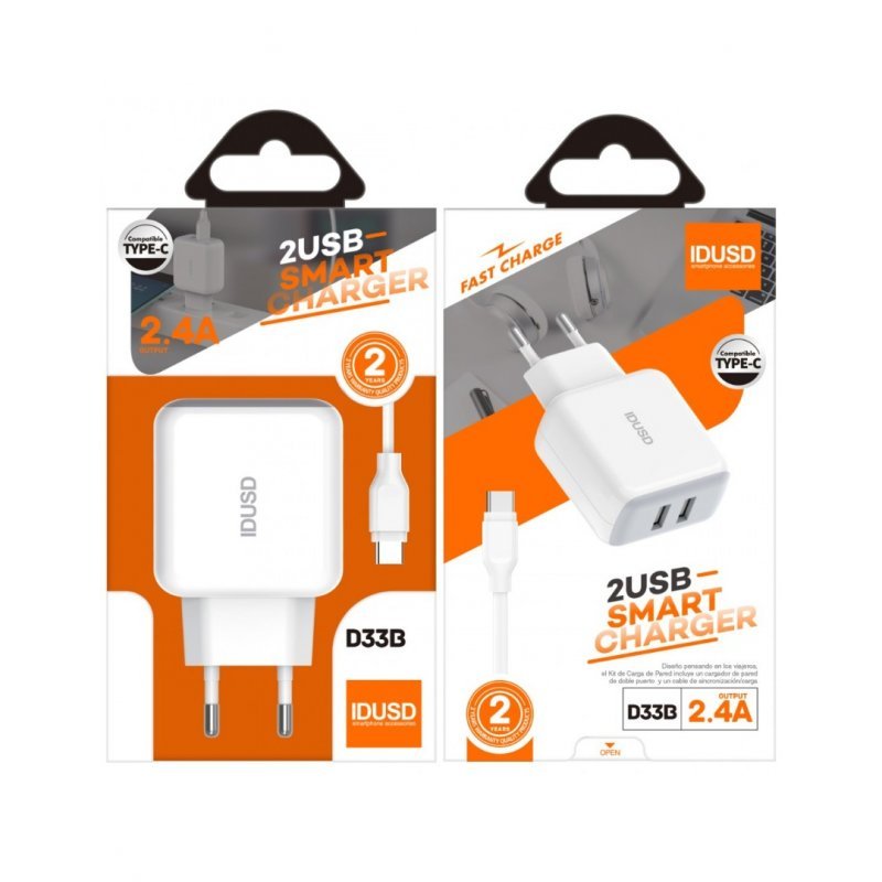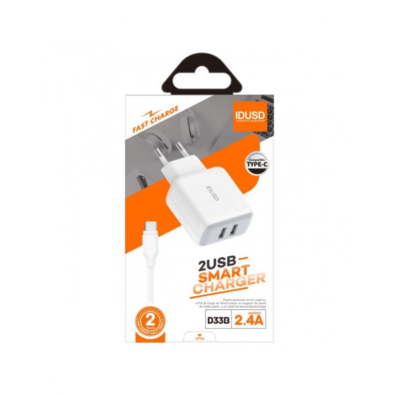 Smart Charger 2 puertos USB 2.4A + Turbo Cable Type – C 1.2 metros – D33BCompacto cargador de 12W de diseño elegante y minimalista ideal para cargar rápidamente todos los dispositivos ya sea un teléfono móvil como una tablet.Este super cargador está diseñado y fabricado con innovadoras tecnologías electrónicas que garantizan el control del sobre calentamiento y la protección contra sobrecargas y cortocircuitos durante toda la fase de carga.Especialmente diseñado y pensando para viajeros y para el hogar y oficinas, el kit de carga incluye un cargador y un turbo cable type C de 120 centímetros para sincronización y carga de teléfonos móviles y tabletas.El cable es ultra rápido y especial para la carga y la sincronización de datos de forma rápida y efectiva.