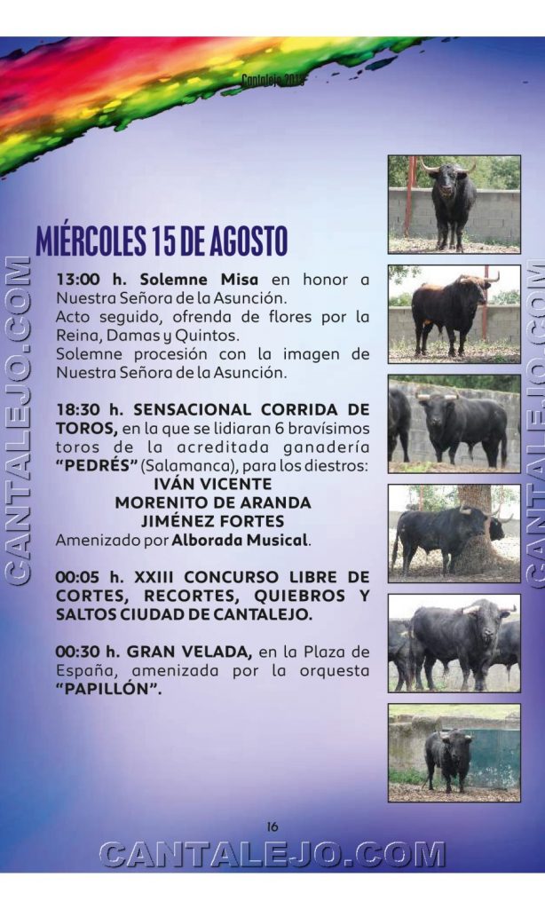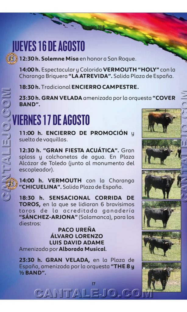 18:30 h. SENSACIONAL CORRIDA DE TOROS, en la que se lidiaran 6 bravísimos toros de la acreditada ganadería «PEDRÉS» (Salamanca), para los diestros: